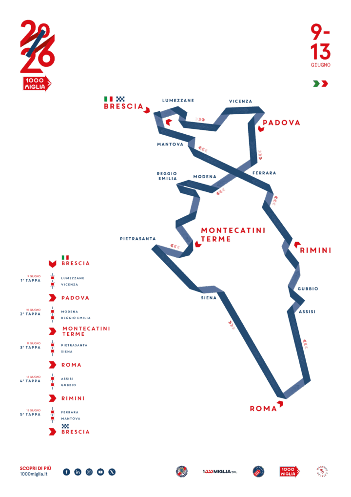 Mille Miglia Brescia- Roma- Brescia si svolgerà dal 09 al 13 giugno.
